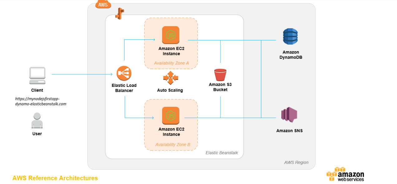 Launch a Node.js web application environment using AWS Elastic Beanstalk and Amazon DynamoDB. Elastic Beanstalk provisions and manages the underlying infrastructure (e.g., Amazon EC2 instances) and stack components (e.g., OS, web server, language/framework) for you. DynamoDB provides the NoSQL database.